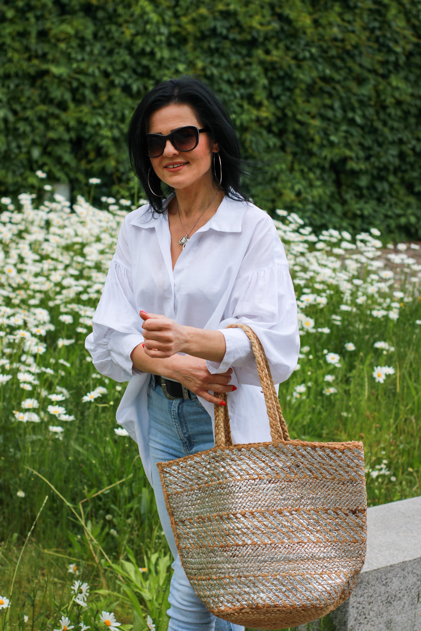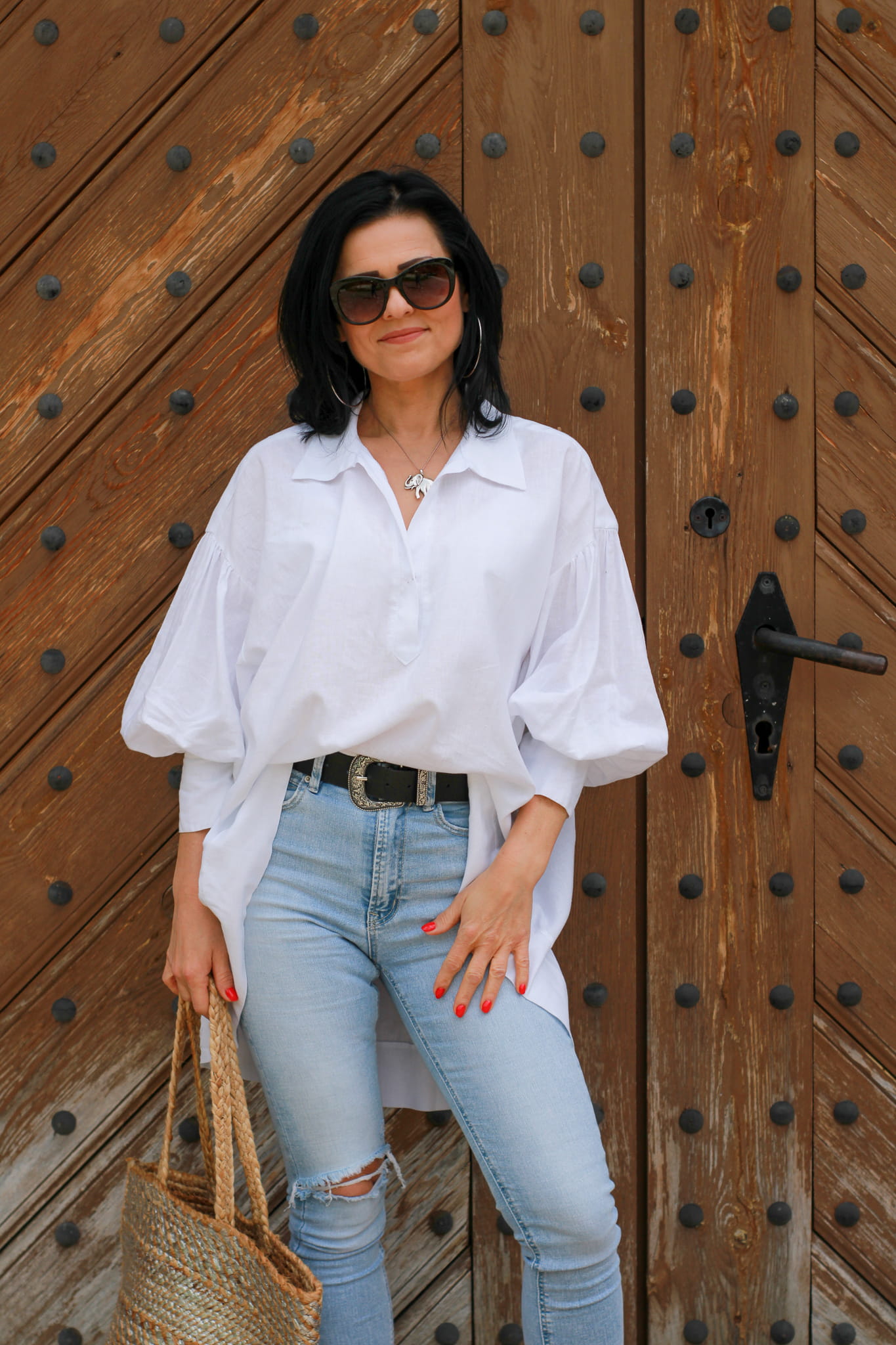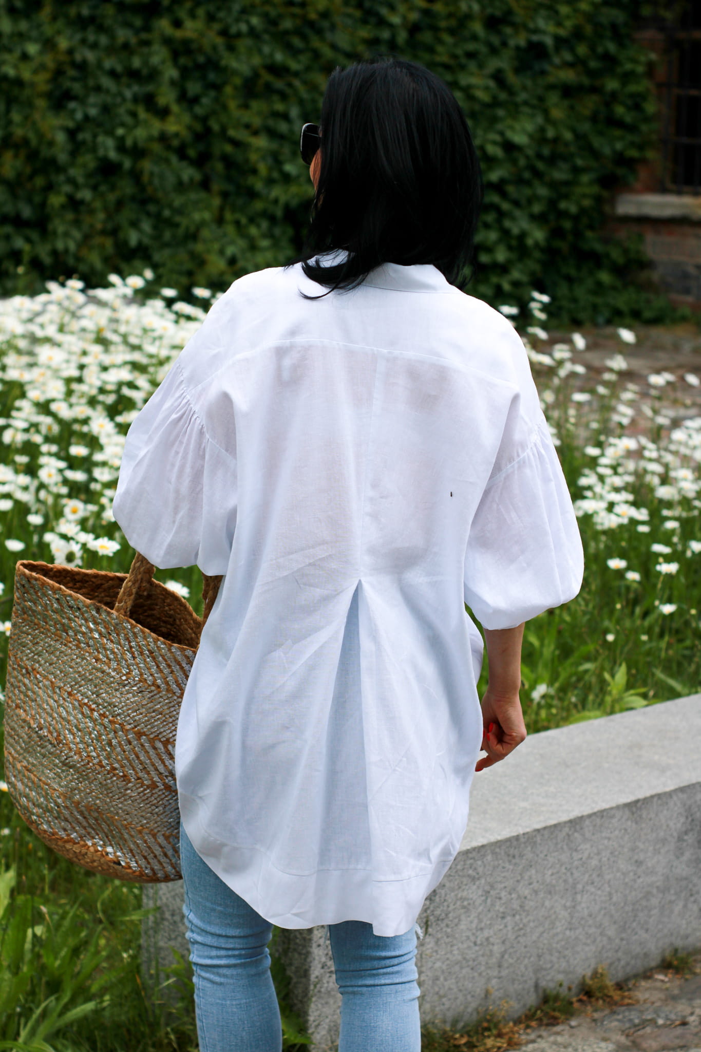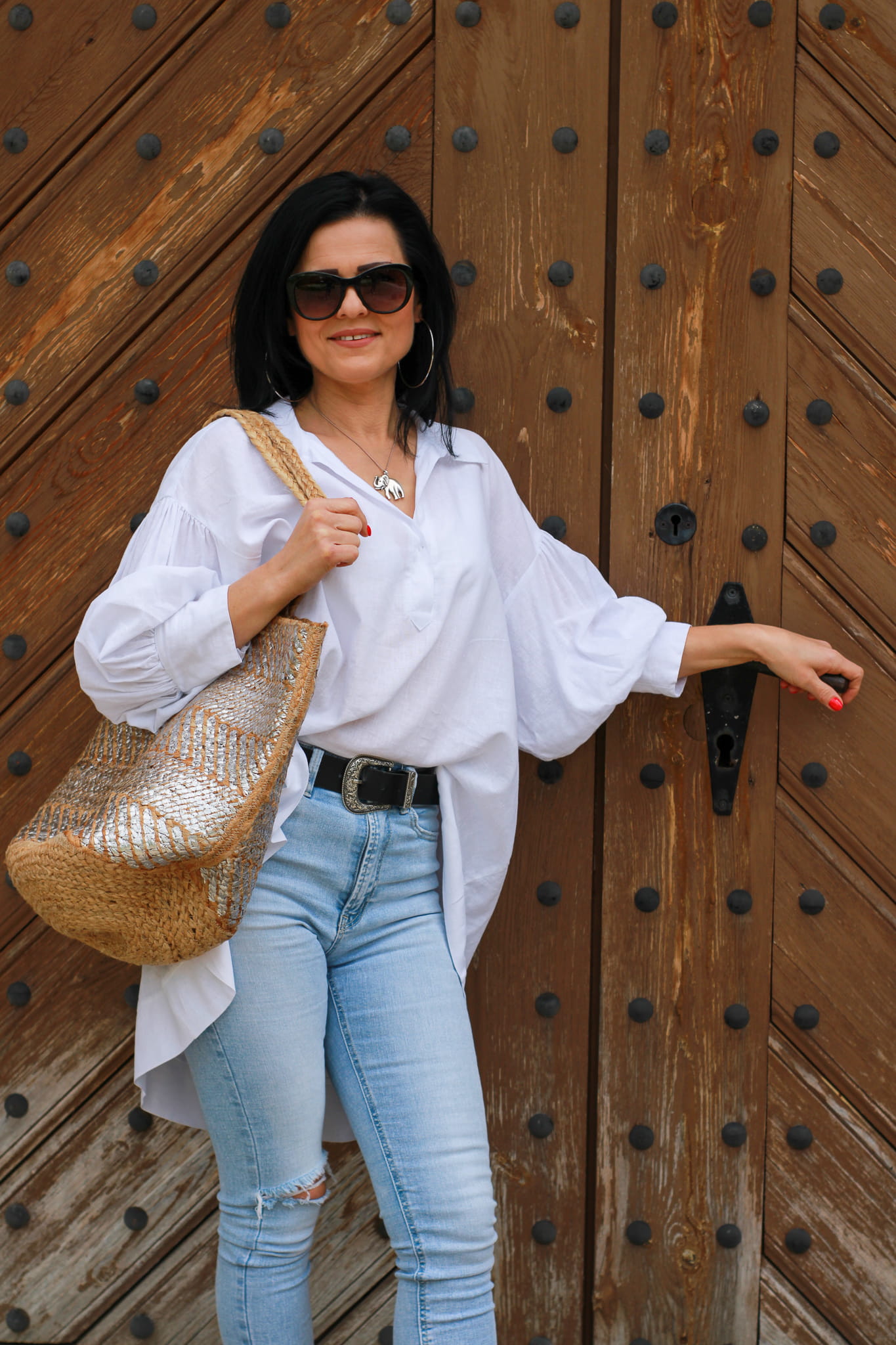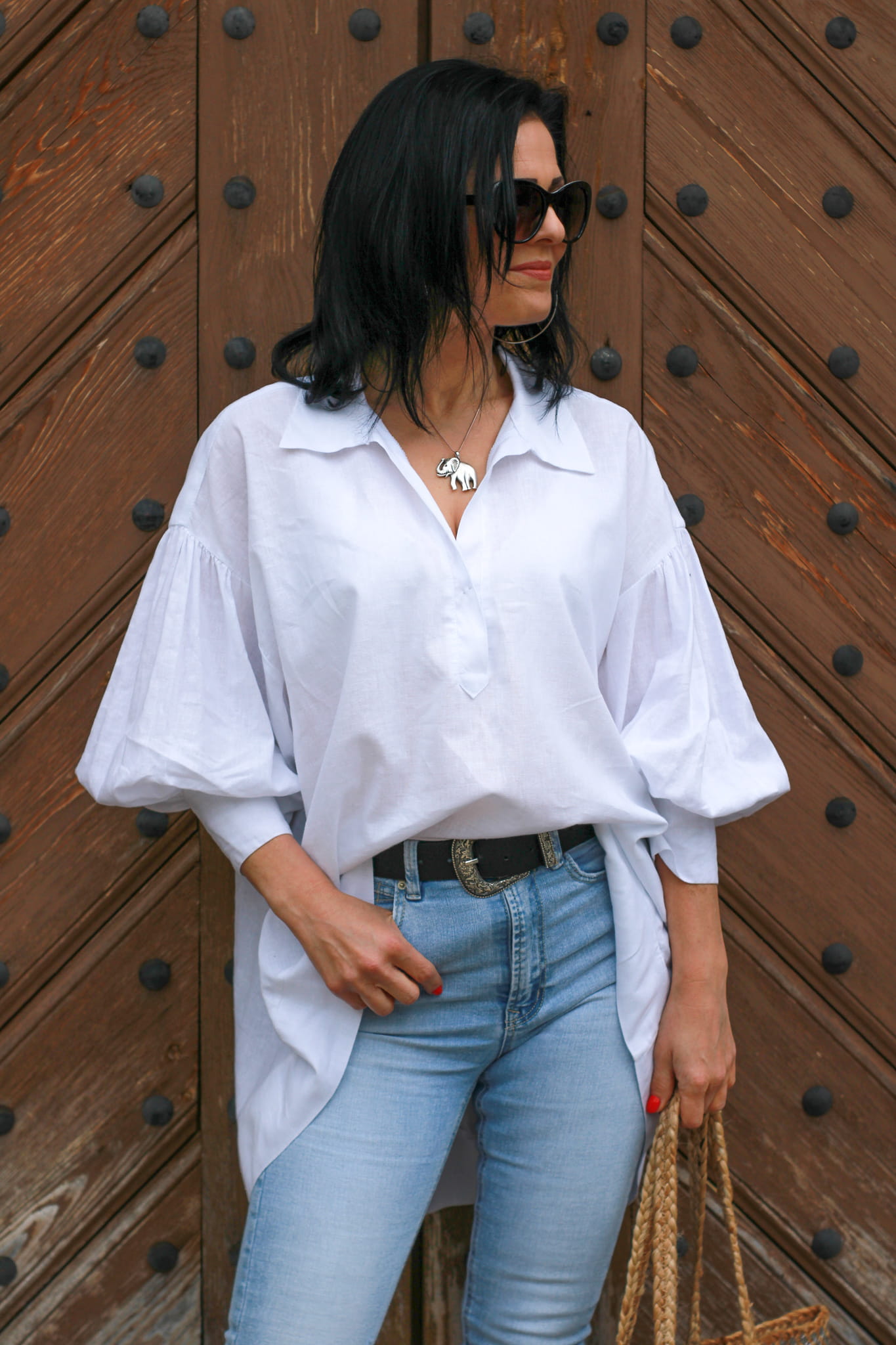 Przepiękna oversizowa koszula z kołnierzykiem. Luźny krój oraz naturalna lniana tkanina daje niesamowity komfort noszenia. Przód koszuli jest krótszy, tył dłuższy- z ozdobnym karczkiem i kontrafałdą. Możesz ją nosić puszczoną luźno lub włożoną z przodu w spodnie. Marszczony doszywany rękaw zakończony jest mankietem na gumce. Wszystkie nasze ubrania są zaprojektowane i szyte we własnej szwalni w Poznaniu.
