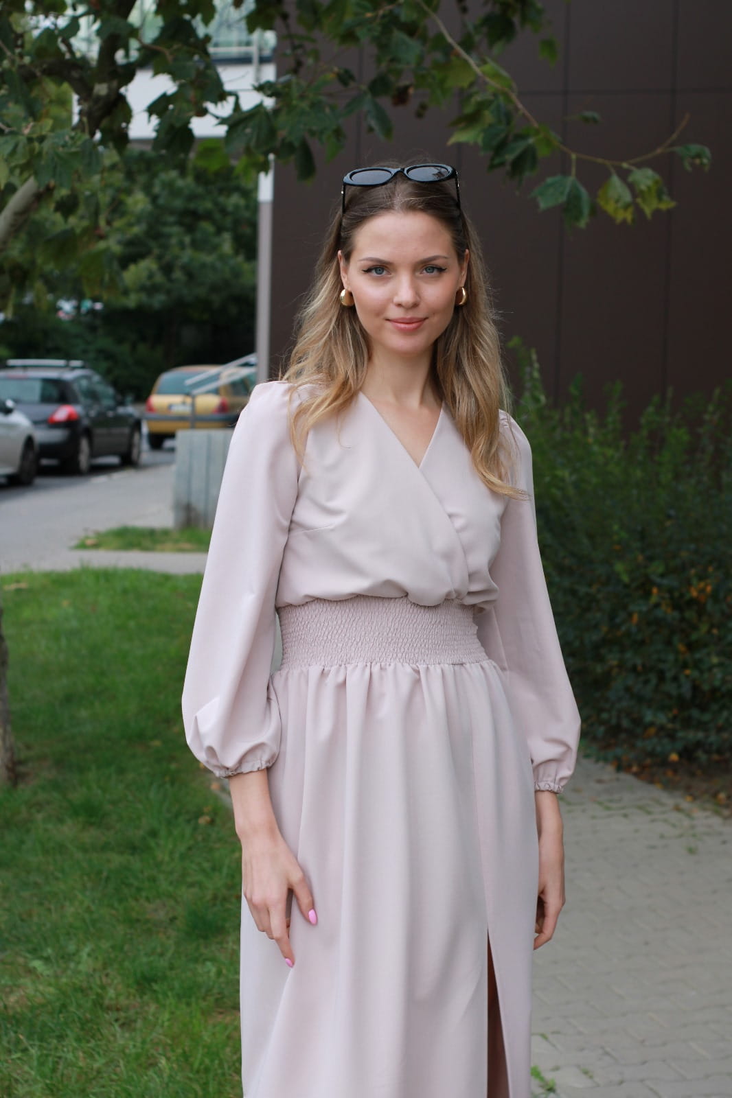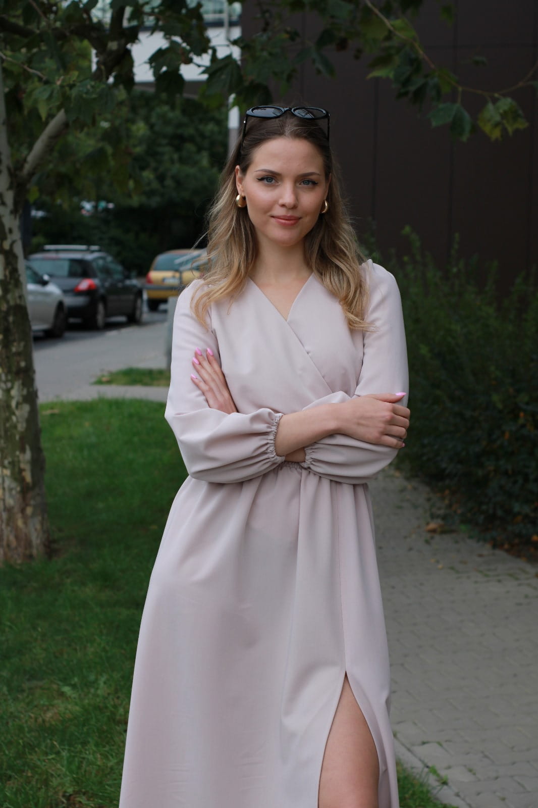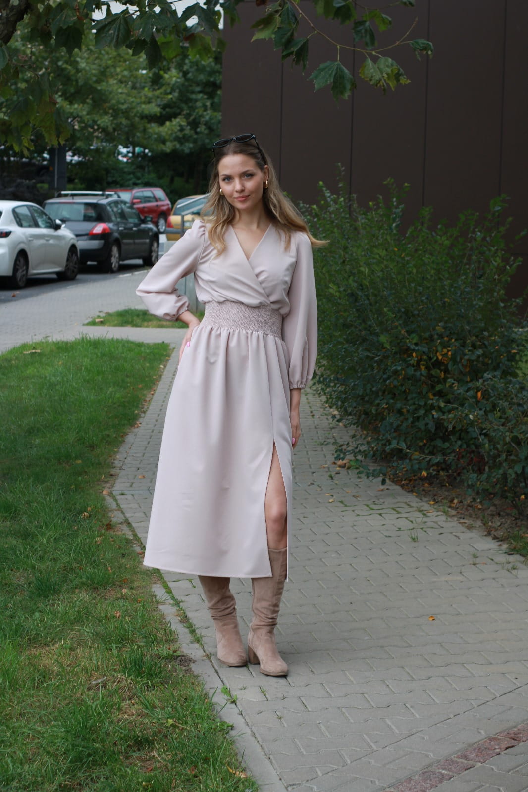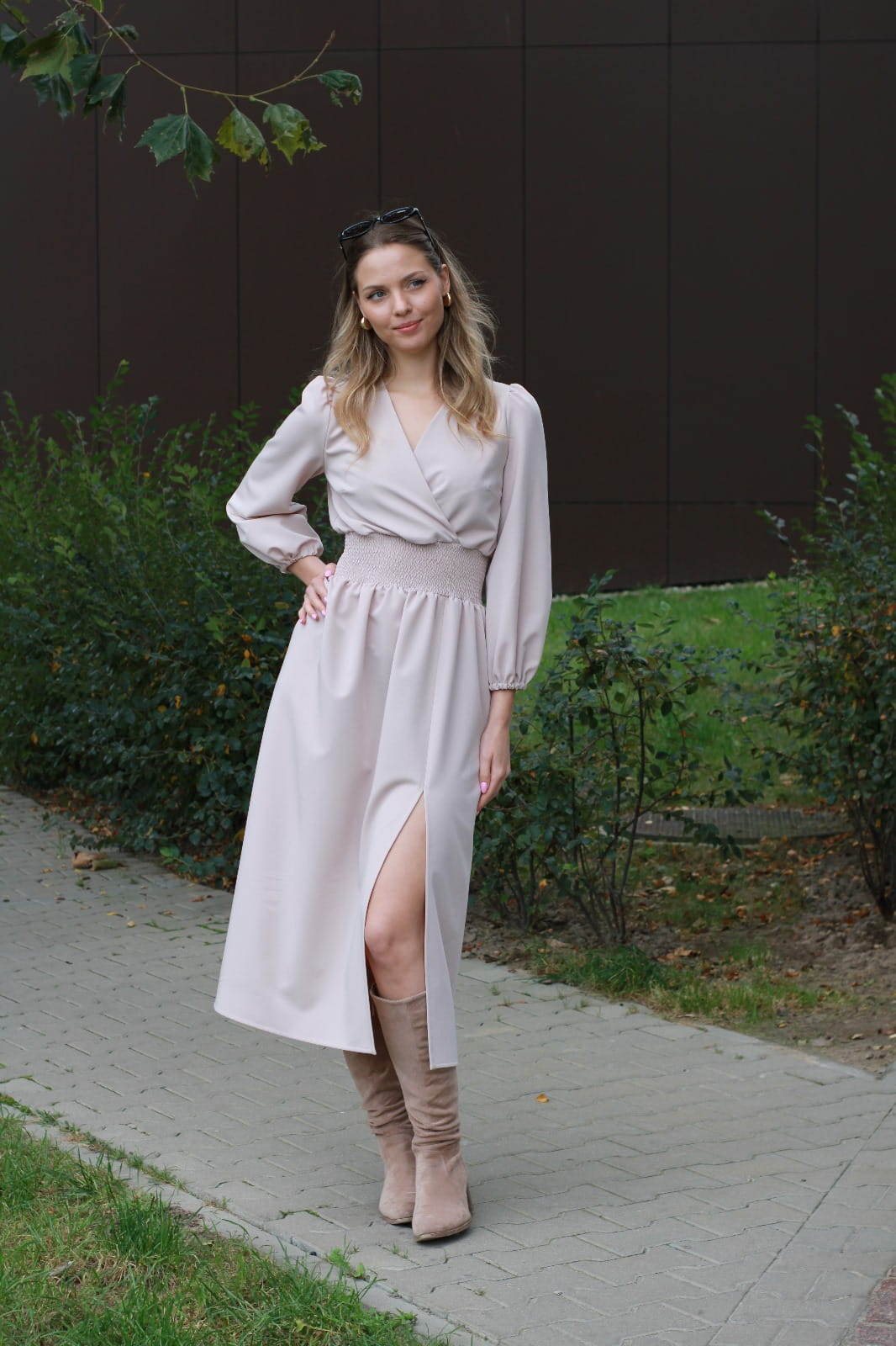 Sukienka Ania MIDI ma piękny zakładany dekolt. Kopertowy dekolt, szeroki pas gumowy w talii doskonale podkreśla kobiece kształty. Długi rękawek zakończony gumką. Model sukienki jest bardzo uniwersalny. W zależności od dodatków, pasuje na każdą okazję. Zarówno do pracy jak i wielkie wyjście. Idelna dla kobiet, które cenią jakość i wygodę.